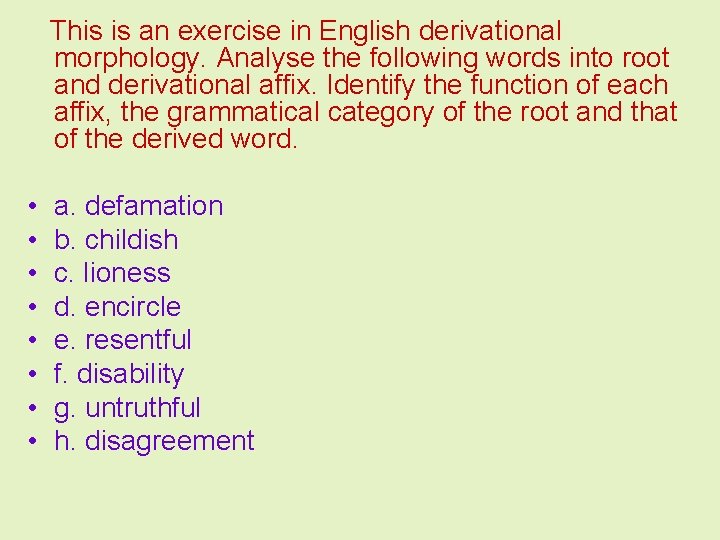 This is an exercise in English derivational morphology. Analyse the following words into root and derivational affix. Identify the function of each affix, the grammatical category of the root and that of the derived word. • • a. defamation b. childish c. lioness d. encircle e. resentful f. disability g. untruthful h. disagreement