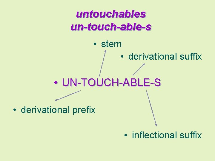 untouchables un-touch-able-s • stem • derivational suffix • UN-TOUCH-ABLE-S • derivational prefix • inflectional suffix