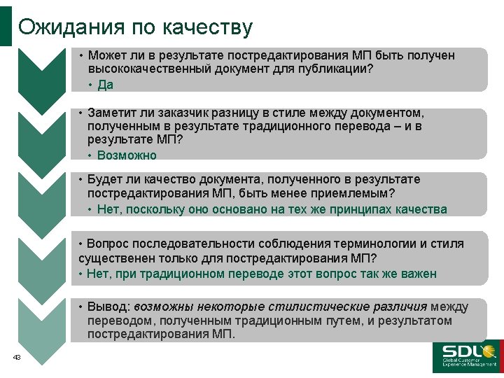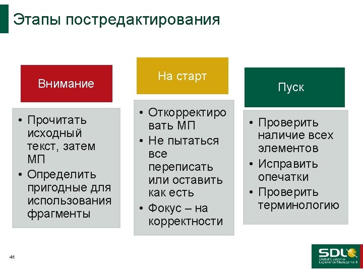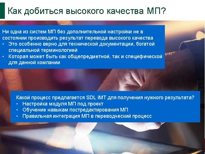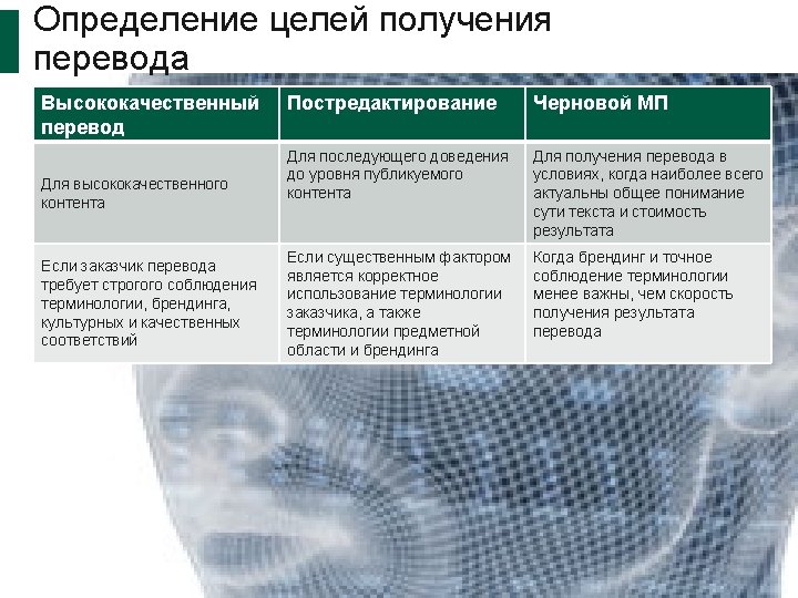Понимание различий III Исходный немецкий Черновой МП Отредактирован ный МП Ручной перевод Mit unserer Erfahrung im technischen und organisatorischen Bereich, sind wir der kompetente Ansprechpartner für unseren Kunden. With our experience in technical and organizational area, we the skilled point of contact for our customers. With our experience in the technical and organizational area, we are a skilled point of contact for our customers. With our technical and organizational experience, we are a trusted partner for our customers.