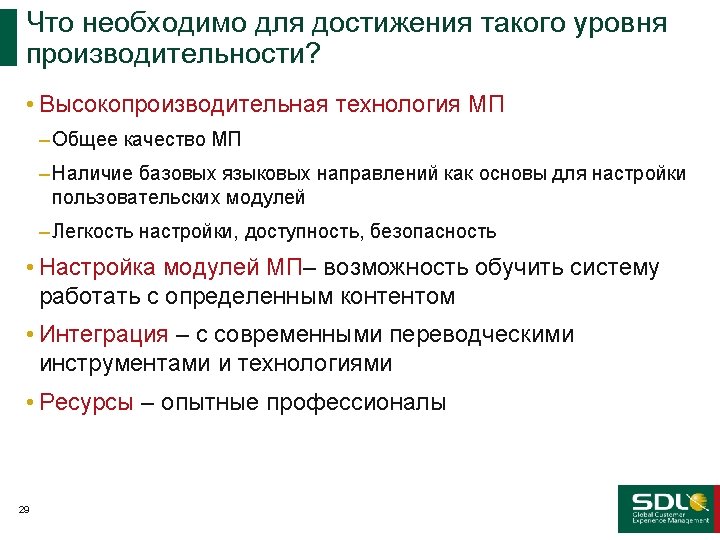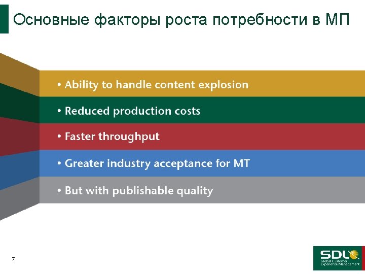 Определение типов контента КАЧЕСТВО vs ОБЪЕМ vs ВИДЫ ПЕРЕВОДОВ Websites Advertising Software User Interface Качество Legal / Contracts Marketing Content Newsletters Help HR Docs User Guides Product Descriptions Ручной перевод Требуются переводы высокого качества Documentation/Manuals Машинный перевод Knowledge Base FAQ Email Support Alerts/Notifications Постредактирование User Forums SMS User Reviews email Wikis IM Volume Blogs В требуемых объемах переводить не сможет никто Объем