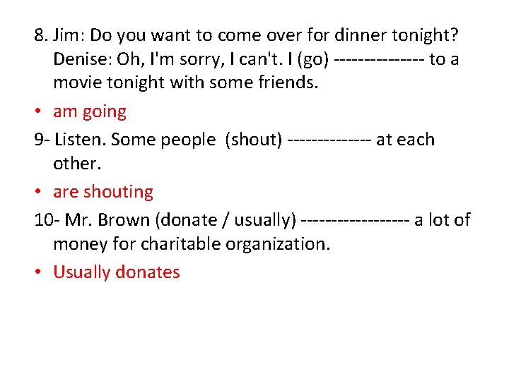 8. Jim: Do you want to come over for dinner tonight? Denise: Oh, I'm sorry, I can't. I (go) -------- to a movie tonight with some friends. • am going 9 - Listen. Some people (shout) ------- at each other. • are shouting 10 - Mr. Brown (donate / usually) --------- a lot of money for charitable organization. • Usually donates