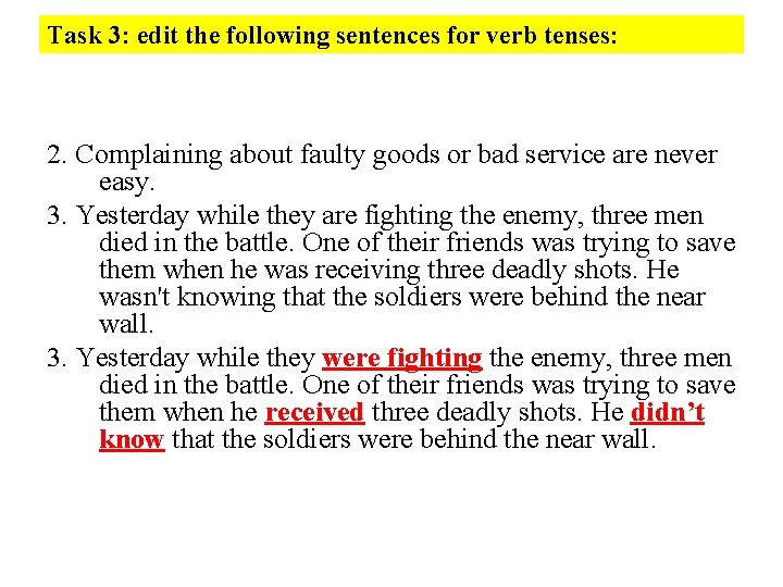 Task 3: edit the following sentences for verb tenses: 2. Complaining about faulty goods or bad service are never easy. 3. Yesterday while they are fighting the enemy, three men died in the battle. One of their friends was trying to save them when he was receiving three deadly shots. He wasn't knowing that the soldiers were behind the near wall. 3. Yesterday while they were fighting the enemy, three men died in the battle. One of their friends was trying to save them when he received three deadly shots. He didn’t know that the soldiers were behind the near wall.