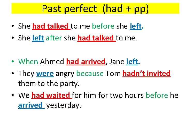 Past perfect (had + pp) • She had talked to me before she left. • She left after she had talked to me. • When Ahmed had arrived, Jane left. • They were angry because Tom hadn’t invited them to the party. • We had waited for him for two hours before he arrived yesterday.