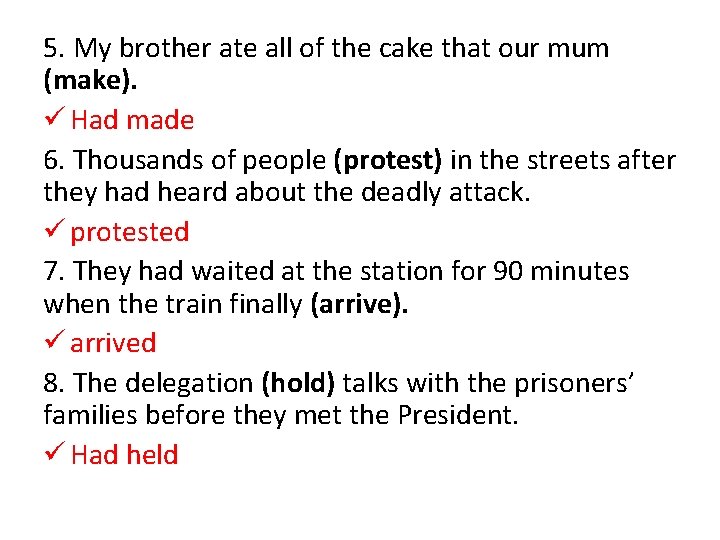 5. My brother ate all of the cake that our mum (make). ü Had made 6. Thousands of people (protest) in the streets after they had heard about the deadly attack. ü protested 7. They had waited at the station for 90 minutes when the train finally (arrive). ü arrived 8. The delegation (hold) talks with the prisoners’ families before they met the President. ü Had held