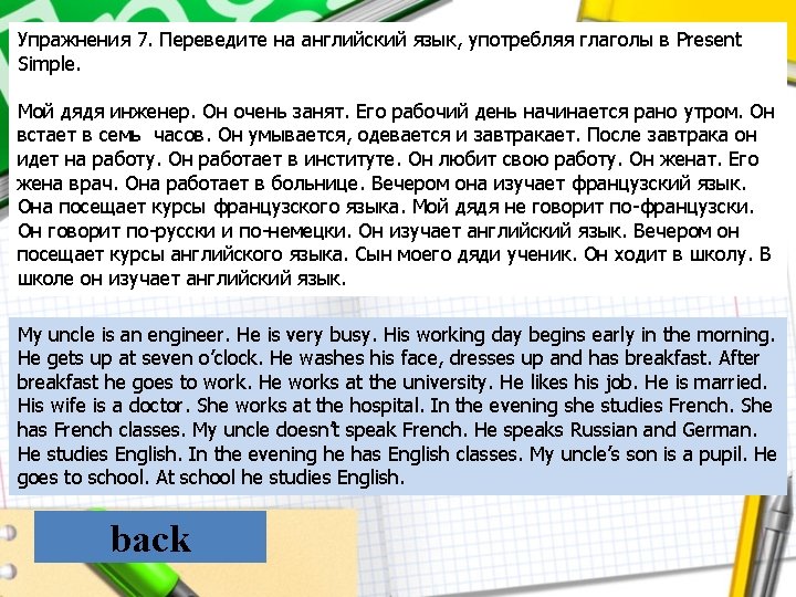 V 1; Vs (Глагол в 1 форме; глагол с окончанием “s” в 3 лице ед. числа) Present Simple/Present Continuous 1. Water boils / is boiling at 100 degrees celsius. (boil) 2. The moon goes / is going round the earth (go) 3. I usually go / is going to work by car. 4. I hear / am hearing you've got a new job. 1. 2. 3. 4. 5. 6. 7. My sister (to get) up at eight o'clock. She (to be) a school girl. She (to go) to school in the afternoon. Jane (to be) fond of sports. She (to do) her morning exercises every day For breakfast she (to eat) two eggs, a sandwich and a cup of tea After breakfast she (to go) to school. She (to speak) French well. It (to take) him two hours to do his homework back TRAINNING