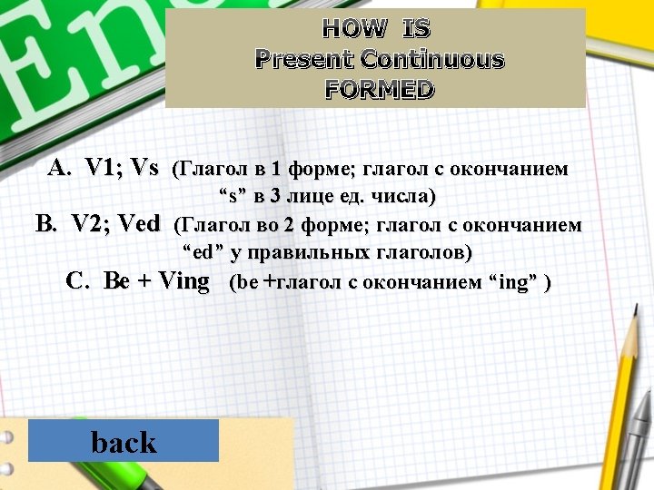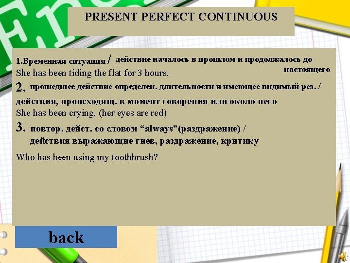 Настоящее совершенное продолженное A. Present Simple Continuous B. Present Perfect Continuous back