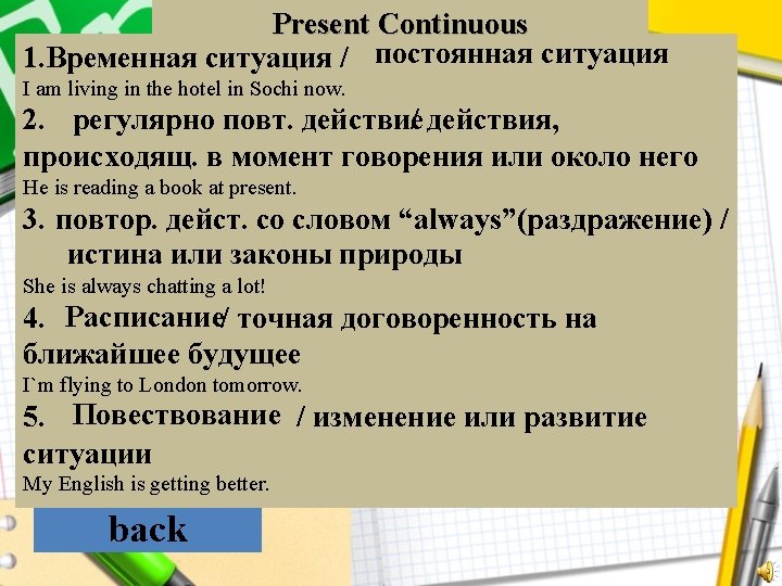 Examples I am living in the hotel in London now. She is looking for a better job. She is always interrupting me! We are visiting our grandma today. His English is getting better. back TRAINNING