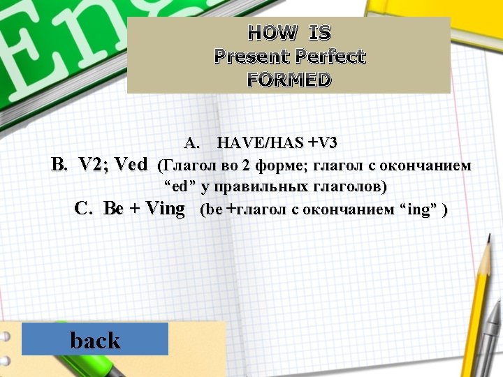 HOW IS Present Perfect Continuous FORMED A. HAVE/HAS +V 3 B. Have been +Ving C. Ве + Ving back