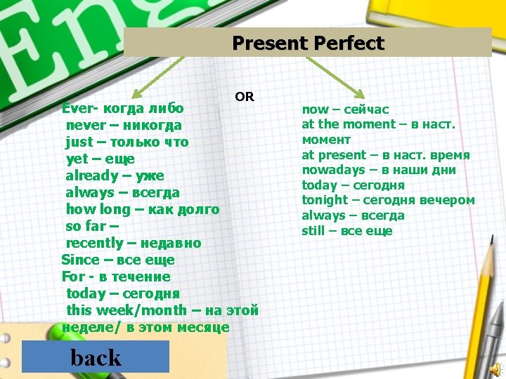 Настоящее совершенное A. Present Simple B. Present Continuous C. Present Perfect back