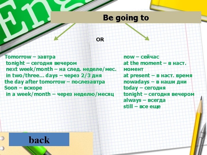 Собираться сделать ч-л A. Be going to B. Have to C. Can do back