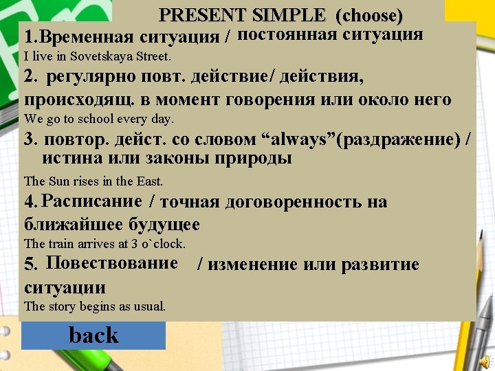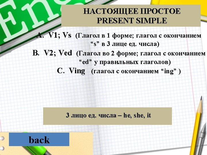 НАСТОЯЩЕЕ ПРОСТОЕ A. Present Continuous B. Present Simple C. Past Simple back