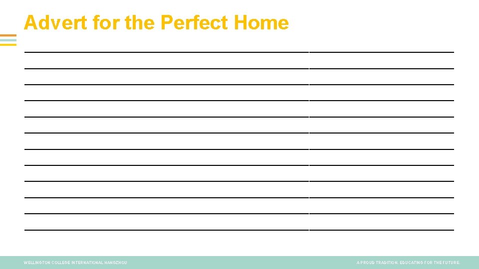 Designing the Perfect House • If you were designing the perfect house, what would it have? • Think about how many rooms it would have, what it would look like, what the garden would have, what gadgets the whole house would have. • If you want to, take some time to draw and design the house. Maybe you could make a model of the house? WELLINGTON COLLEGE INTERNATIONAL HANGZHOU A PROUD TRADITION. EDUCATING FOR THE FUTURE.