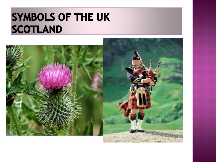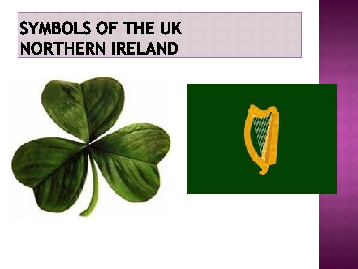COAT OF ARMS The coat of arms represents a quartered shield. In the first and fourth quarters you can see lions which symbolize England, in the second there is a rampant lion and a fleur-de-lis [flɜ: də'li: ] which symbolize Scotland in the third there is a harp for Ireland. The shield is being taken by a guardant lion (a symbol of England) wearing St. Edward’s crown and a unicorn which symbolizes Scotland. Under the shield you can also see a flowerbed with Tudor roses (England), a thistle (Scotland) and a shamrock (Ireland).