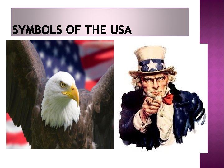 THE GREAT SEAL OF THE UNITED STATES In the centre there is a shield almost similar to the American flag. However, there are no stars and the stripes are white (not red). The supporter of the shield is a bald eagle. It holds 13 arrows (symbolizing 13 states) and an olive branch (a symbol of peace) with 13 leaves and 13 olives. In the eagle’s beak you can see a scroll with the motto Et pluribus unum (Out of many, One). There is also a motto which says In God We Trust.