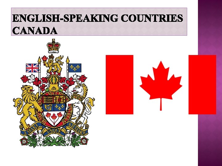 COAT OF ARMS The word Canada is believed to come from the word Kanata which means “village” or “settlement”. The coat of arms as you can see is quite similar to the British one. However, some Canadian symbols have been added. For instance, the famous maple leaf which you can also see in the flag. You can also see a motto which says A Mari usque ad Mare which means From sea to sea.