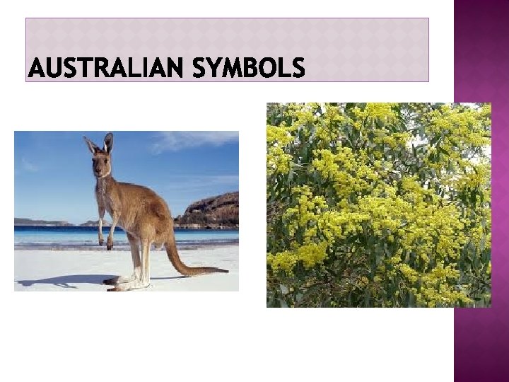 A GOLDEN WATTLE It is a tree which flowers in late winter and spring. When in flower, the golden wattle displays the national colors green and gold. Gold means images of Australia’s beaches, mineral wealth, grain harvests and the Australian wool. Green evokes the forests, eucalyptus trees and the Australian landscape. The golden wattle is a symbol of unity. In recent times, the golden wattle has been used as a symbol of remembrance and reflection.