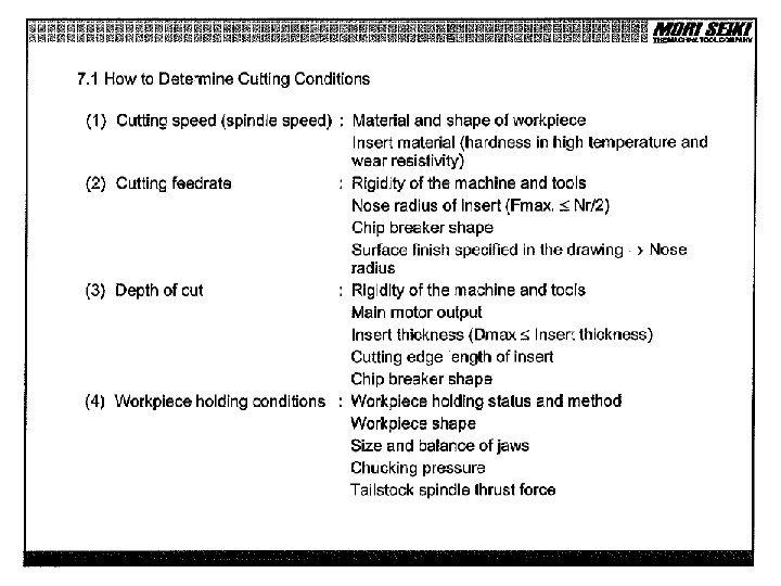 Example Program % O 1 (THAT'S AN OH NOT A ZERO) ; (EXAMPLE PROG - TURN PLUG 20. 0 MM OD X 17 MM LONG) ; (STOCK: ALUM 1. 5" X 17 MM + 10 MM) ; ; (T 1 - CNMG 55 DEG DIAMOND) ; (T 2 - VNMG 15 DEG DIAMOND) ; (T 10 - 3. 175 MM CUTOFF) ; ; (VARIABLES) #500=38. 1 (STOCK DIAMETER) #501=17. 0 (STOCK LENGTH) #502=75. 0 (SURFACE M/MIN FOR CUTTING ALUM) #503=0. 4 (ROUGHING FEED: MM/REV) ; N 1 G 54 (WORK OFFSET) G 21 (METRIC) G 28 U 0 W 0 (GO HOME) G 50 S 2000 (MAX SPINDLE SPEED)