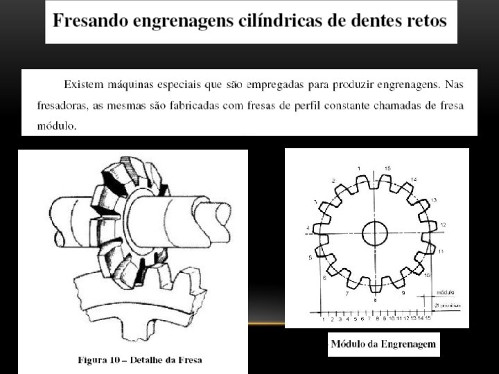 Usinagem: MAIOR PARTE ENGRENAGENS METÁLICAS USADAS PARA TRANSMITIR POTÊNCIA (USINAGEM DE MATERIAIS FUNDIDO, FORJADO OU DISCO LAMINADO A QUENTE) PROCESSOS GROSSEIROS • Fresamento de Forma:
