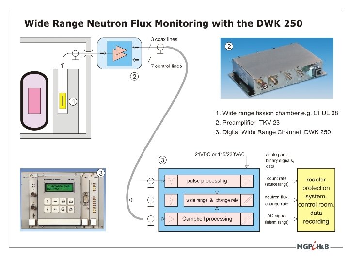 Digital Neutron Flux Monitoring System pro. TK™ / TK 250 – Channel Types DAK 250 Source range or intermediate range monitoring With pulse processing or DC signal processing; reactimeter optional also used for N-16 monitoring with e. g. gamma ionization chamber DWK 250 Wide range monitoring With combined pulse processing and Campbell signal processing for in-core & out-core fission chambers DGK 250 Power range monitoring With 1 or 2 signal paths for neutron ionization chambers or fission chambers … Mirion offers an array of solutions and services for managing radiological hazards. Learn more at: www. mirion. com Radiation Monitoring Systems Division 8