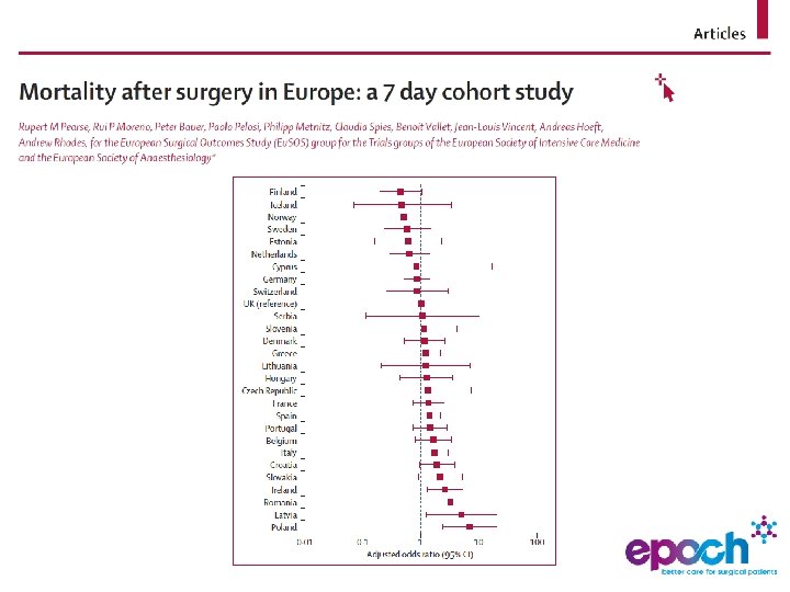 Pilot data • Emergency Laparotomy Network & HES data • Wide variations in standards of care • 30 day mortality varies widely (4 to 31%) • 25% mortality at 90 days Saunders et al. Brit J Anaesth 2012; 109: 368 -75.