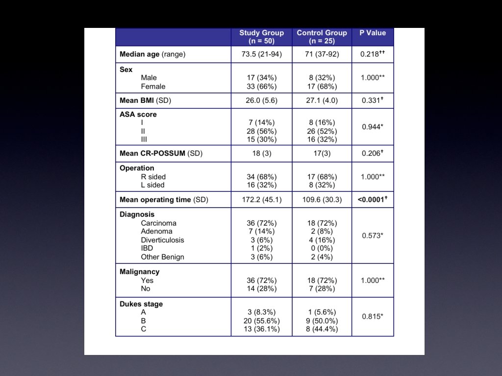 Results • 71 randomised • 11 post randomization exclusions • 60 patients included in analysis • 31 ERAS group • 29 Non ERAS group