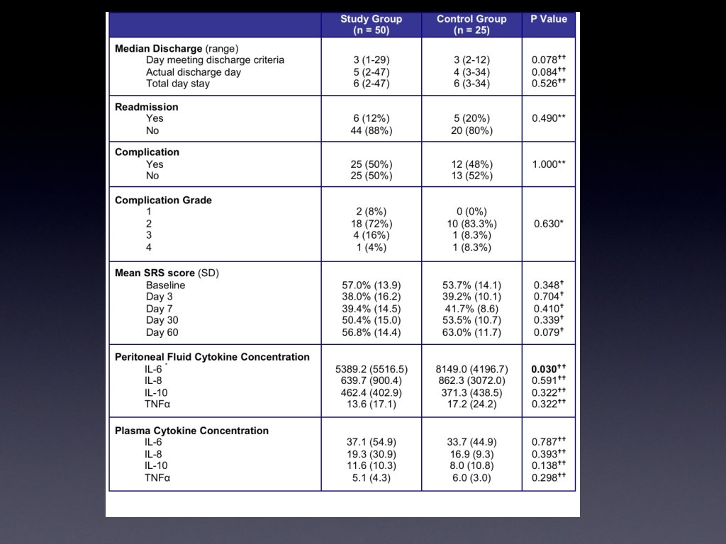 Baseline Characteristics Mean Age ERAS (31) Non ERAS (29) p value 44. 3 43. 6 0. 66 24 (83) 0. 54 1 (3) 0. 027 Female Gender 23 (74) (%) Planned Admit to PCU (%) 8 (26)
