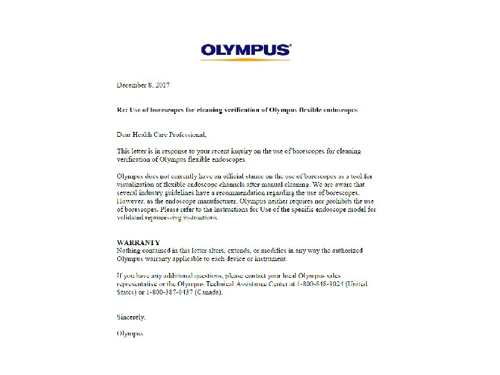Support for using enhanced visual inspection • Borescope inspection identified scratches, discoloration, debris, & fluid • These changed over time • Allowed damaged and contaminated scopes to be identified and reprocessed and sent for repair • When went for repair, manufacturer determined there were critical defects • Reference; Ofstead and associates, AJIC 2016. Article in press.