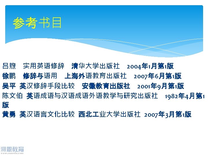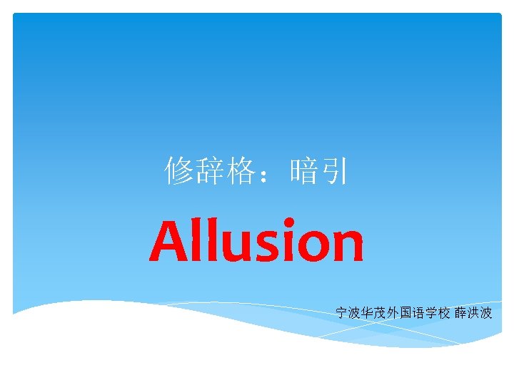 Definition 暗引(allusion): 在表达式引用典故、谚语、成语和俗语等,也叫“ 引喻”,但是不注明出处,不引用全句,因此与新情况 融合后,常有转义或引申,使表达更加含蓄,意味深长。 例如: And the discovery that she was the owner of a disposition so purely that of the dog in the manger had something in it which at first made her ashamed. (Thomas Hardy: The Return of the Native) 典出《伊索寓言》,狗睡在马槽里,不吃草,害得
