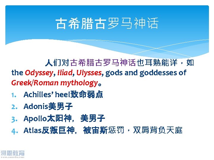 圣经 1. 2. 3. 4. 5. 6. Genesis创世纪 Adam亚当, Eve夏娃;人类鼻祖 Satan撒旦;魔鬼 forbidden fruit禁果 original sin原罪 Noah and the ark诺亚方舟