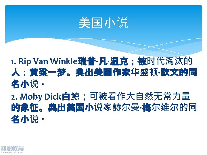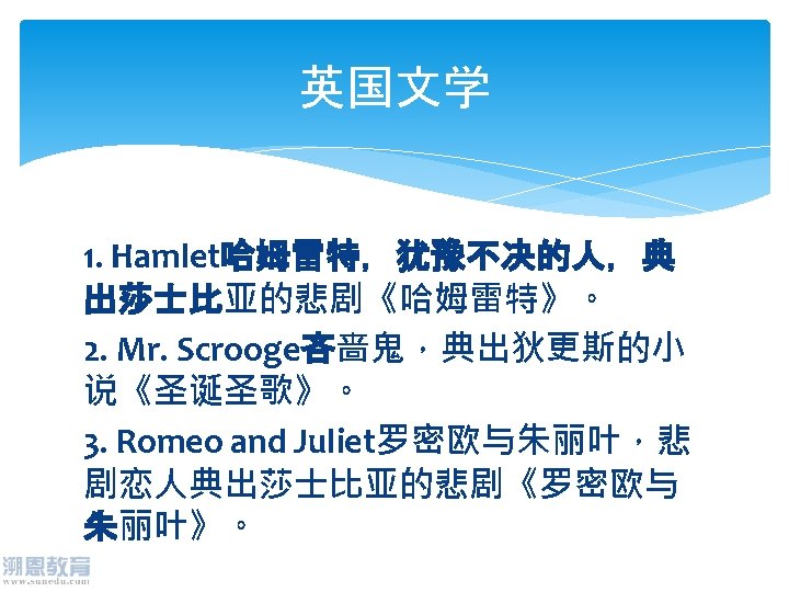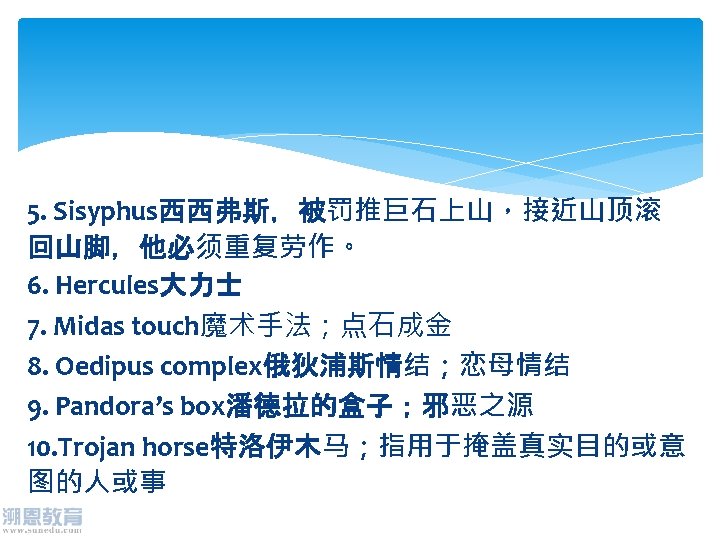2. 童话,神话,传说,寓言 英语国家的孩子大多读过下列童话,如 Cinderella, The Sleeping Beauty, the Pied Piper of Hamelin, Goldilocks and Three Bears, The Emperor’s New Clothes, Sinbad the Sailor, Ali Baba and the Forty Thieves, Beauty and the Beast, Aladdin and the Wonderful Lamp, Blue Beard, Red Riding Hood, the Little Mermaid, the Three Little Pigs, the Ugly Duckling, the Fisherman and the Genie. 传说如King Arthur and His Roundtable Knights, Robin Hood, Holy Grail. 寓言, 尤其 是Aesop’s fables,如sour grapes, the boy who cried “wolf”, the lion’s share, the hare and the tortoise等.