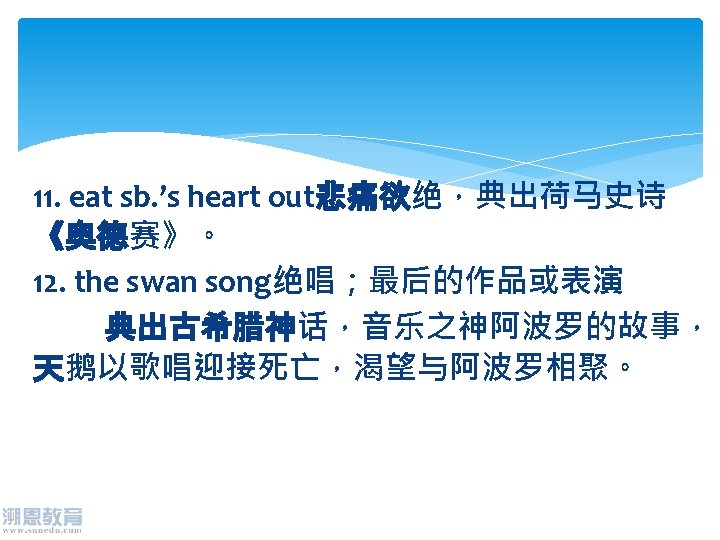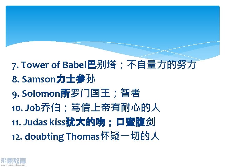 13. the lost sheep迷途的羔羊 14. the eleventh hour最后一刻 15. the good Samaritan义人;助人为乐者 16. apocalypse大劫难 17. The salt of the earth社会中坚、精英 18. A fly in the ointment美中不足;白玉无瑕