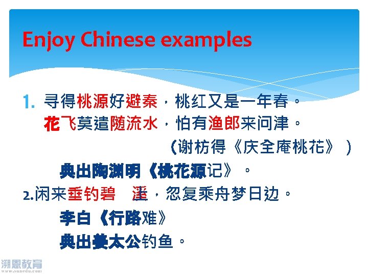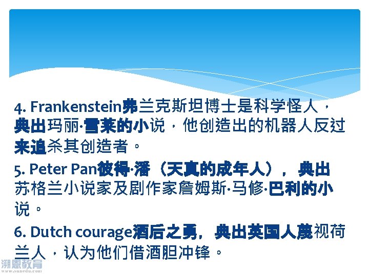 Enjoy English examples 1. “You want your pound of flesh, don’t you? ” (Doris Lessing: In Pursuit of the English) 典出莎士比亚的《威尼斯商人》,残忍的高 利贷者Shylock。 2. I have never seen an individual who has dared in my own house to question my own authority. I have nourished a viper(毒蛇) in my bosom. (W. Thackeray: Vanity Fair) 典出《伊索寓言》的农夫与蛇的故事。