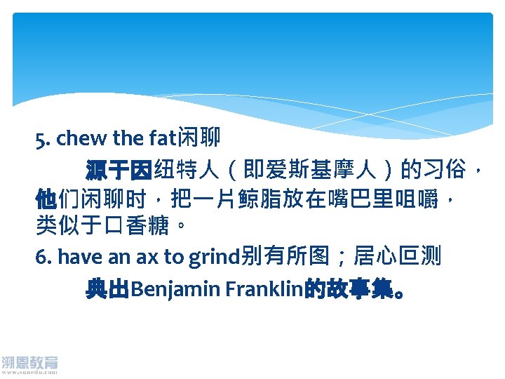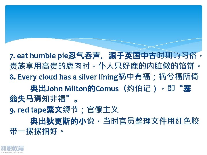 19. a drop in the bucket沧海一粟;九牛一毛 20. A little fire kindles a forest. 星星之火可以燎原 21. a thorn in the flesh眼中钉肉中刺 22. Do as you would be done by. 己所不欲勿施于人 23. He who will not work shall not eat. 不劳者不得食 24. land of promise; promised land乐土;希望之乡 25. the king of terrors死神