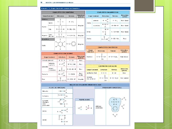 PUENTE SALINO Enlace iónico en agua: los iones (K+, Na+, Cl +) interactúan entre cargas opuestas. Los iones se atraen o se repelen de acuerdo a su carga. Es débil ya que al estar en agua (solvatados), se reduce la fuerza de sus enlaces. Grupos funcionales que se comportan como iones en p. H fisiológico: Carboxilo y amino.