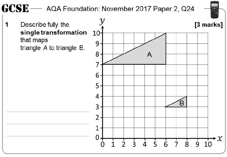 AQA Foundation: November 2017 Paper 2, Q 24 1 Describe fully the single transformation that maps triangle A to triangle B. [3 marks] AQA Foundation: November 2017 Paper 2, Q 24 1 A Describe fully the single transformation that maps triangle A to triangle B. [3 marks] A B B AQA Foundation: November 2017 Paper 2, Q 24 1 Describe fully the single transformation that maps triangle A to triangle B. [3 marks] A B
