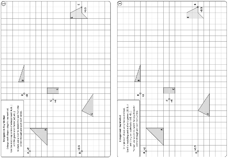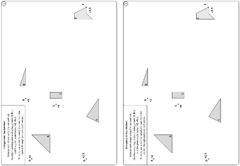 ① Enlargement: Ray Method Enlarge each shape using the ray method. Use the matching centre of enlargement (A, B…) and the given scale factor (× 2, × 3…). To start, use a ruler to sketch the rays from the centre through and past each vertex. B B × 3 A × 2 A C × 4 C E E D × 2. 5 × 3. 5 C