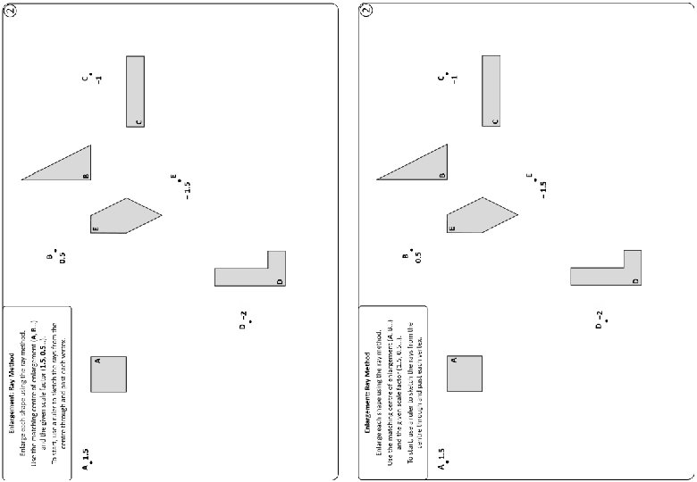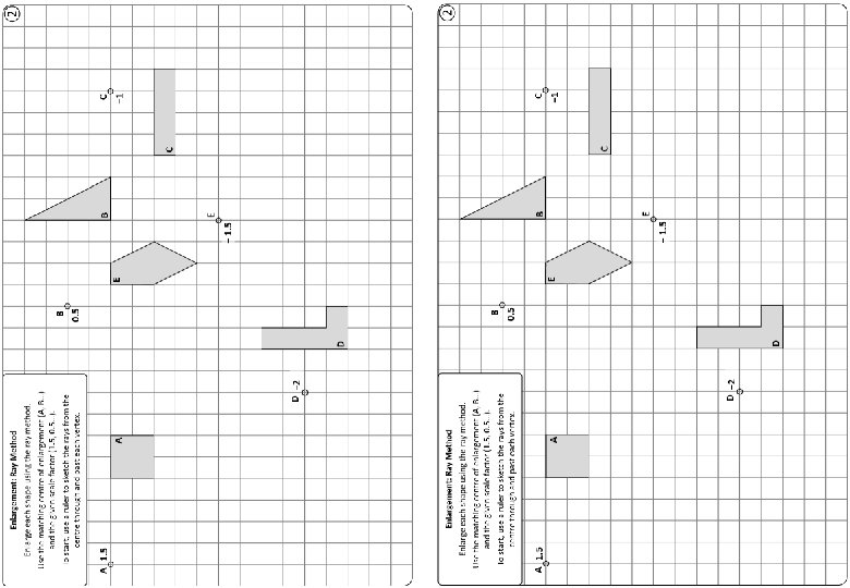 ② Enlargement: Ray Method Enlarge each shape using the ray method. Use the matching centre of enlargement (A, B…) and the given scale factor (1. 5, 0. 5…). B 0. 5 To start, use a ruler to sketch the rays from the centre through and past each vertex. A 1. 5 E A C B − 1 C E − 1. 5 D − 2 D