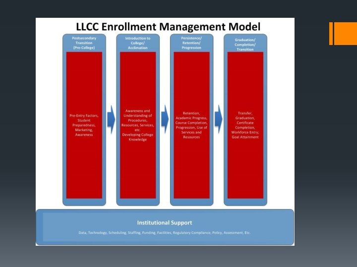 The Plan - continued Institutional Support § Improve data systems and reporting § Maximize use of Colleague § Improve access to and use of data to inform and support decision making regarding items listed above § Review space utilization across LLCC District § Determine baseline space utilization § Optimize space utilization to maximize course and program offerings § Develop a process to determine enrollment projections. § Review existing processes impacting credit hour and headcount estimates