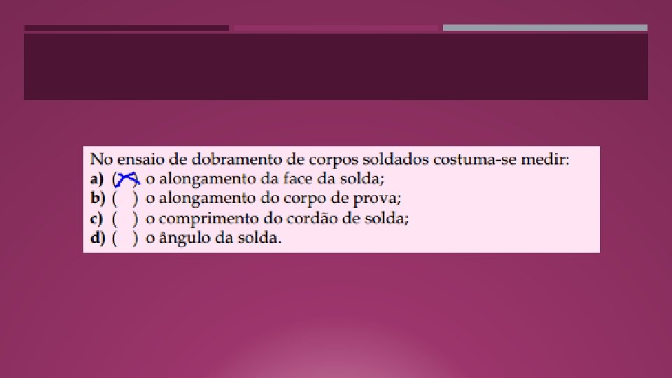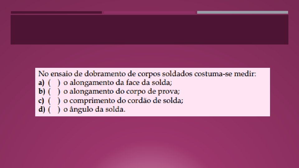 ENSAIO DE DOBRAMENTO EM CORPOS DE PROVAS SOLDADOS O ensaio de dobramento em corpos de prova soldados, retirados de chapas ou tubos soldados, é realizado geralmente para a qualificação de profissionais que fazem solda (soldadores) e para avaliação de processos de solda. Na avaliação da qualidade da solda costuma-se medir o alongamento da face da solda. O resultado serve para determinar se a solda é apropriada ou não para uma determinada aplicação.