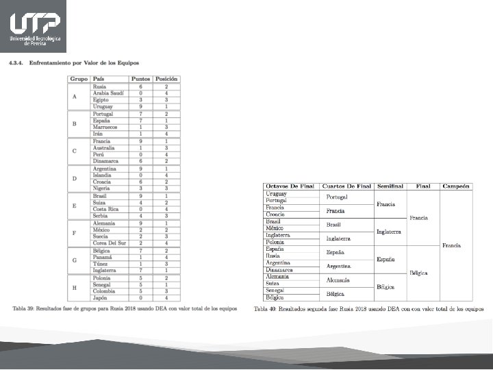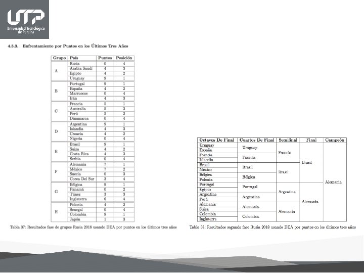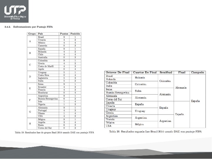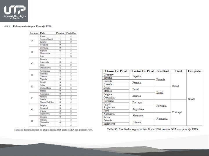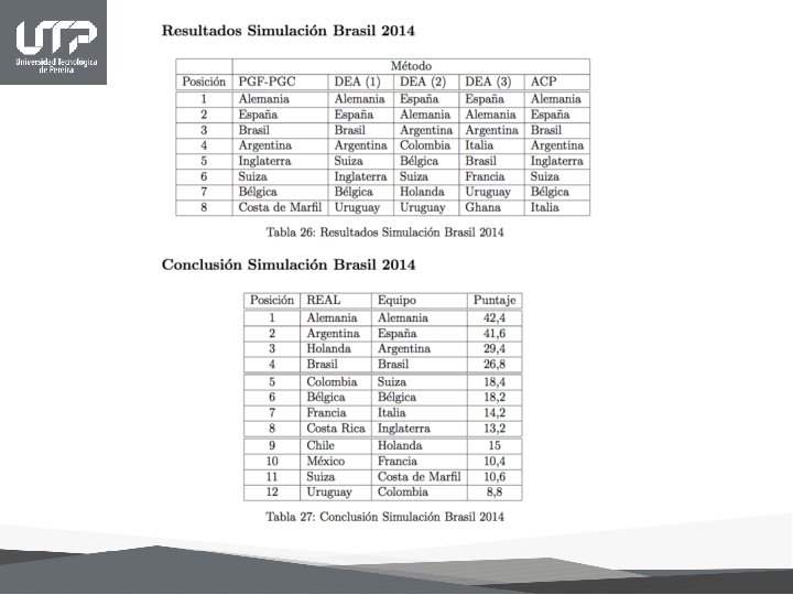 Conclusiones • A partir de las predicciones deportivas es posible encontrar métodos de enseñanza para la aplicación de diferentes tópicos de estadística de análisis multivariante y procedimientos no paramétricos. • El rol del profesor ha cambiado, ahora este debe acudir a que intereses, motivaciones y habilidades tienen sus alumnos. Este debe ser el punto de partida de cualquier tema a enseñar, dejar los espacios para que los estudiantes expresen sus ideas, comenten co mo resolvieron algu n problema, debe creer en las capacidades de los alumnos y realizar un vinculo entre los nuevos conocimientos y los anteriores. • Con la utilización del análisis envolvente de datos (DEA) y análisis de componentes principales (ACP) se logran identificar las variables que hacen que los equipos de fútbol presenten un desempeño eficiente en cuanto a su rendimiento. Las variables históricas son las más relevantes en la eficiencia, pero el factor presente tiene un alto índice de importancia así es pues que la adecuada coordinación entre ellas arrojan mejores resultados. • No existe un método infalible que pueda predecir con exactitud lo que pueda ocurrir en un evento de tal magnitud como lo es la Copa Mundial de Fútbol, pero la combinación de varios de estos métodos nos pueden acercar a la realidad de los resultados, entre más variables se tengan presentes, más cercano al objetivo estaremos, sin embargo, afortunadamente el fútbol no es completamente predecible, de ser así ¿quién se interesaría en este hermoso deporte?