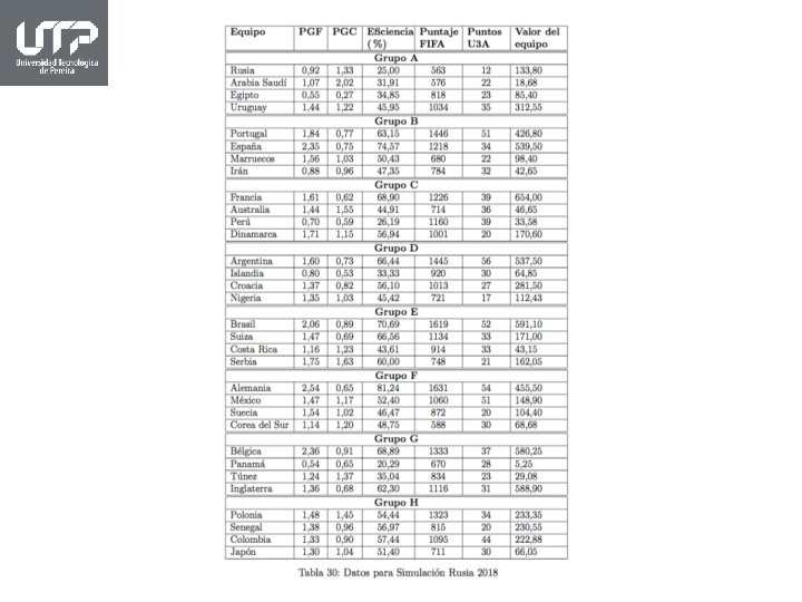 Objetivo general Enseñar diferentes tópicos de estadística a estudiantes de pregrado de la Universidad Tecnológica de Pereira mediante la predicción de eventos deportivos. Objetivos específicos • Usar Simulación en hojas de cálculo (Microsoft Excel) para pronosticar resultados en eventos deportivos. • Aplicar cuatro tipos de pruebas de normalidad para determinar si los resultados obtenidos en una competición deportiva obedecen o no a una distribución normal. • Crear una base de datos generada por las diferentes variables que ofrece una competencia deportiva la cual permita usar en XLSTAT el Análisis de Componentes Principales y Análisis Envolvente de Datos.