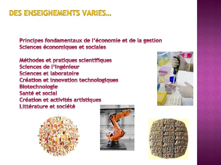 Découvrir différents domaines scientifiques, les métiers et les formations associées. Sciences de la vie et de la Terre, mathématiques, sciences physiques et chimiques, sciences de l’ingénieur. Révèle le goût et l’aptitude aux études scientifiques