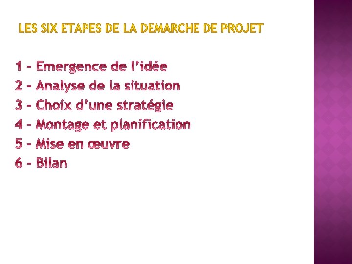 « …Parallèlement à une compréhension et une intégration progressive de la règle, ils apprennent à s’engager dans une démarche de projet… … Projets de performance, … projet tactique… , projet d’action…, projet d’expressions…, projet de jeu… » « …L’enseignement au cycle central prépare l’élève à mettre en œuvre la démarche technologique au travers de la réalisation d’un projet… » « … des projets pluri technologiques multimédia » dès le cycle central L’enseignement en classe de troisième est articulé autour la mise en œuvre d’un ou plusieurs projets collectifs « …La démarche d’investigation, qui rend l’élève davantage acteur de ses apprentissages, et la mise en œuvre de projets scientifiques individuels ou collectifs, contribuent également à développer L’autonomie et l’esprit d’initiative de l’élève… »