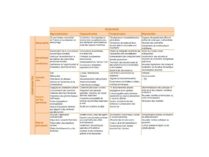 Présentation du projet Territoires 2040 Documents illustratifs et contextualisants: ü Présentation de la démarche : pastille vidéo sur le site de la DATAR, intervenant Stéphane Cordobès, conseiller prospective de la DATAR ü Texte bref modus operandi , texte précisant les objectifs Document d’analyse : Ø 2 cartes de scénarii de systèmes spatiaux pour les territoires français à l’échelle nationale en 2040. Elaborées par le groupe de travail Michel Lussault Ø Autre piste : vidéo de Gilles Pinson, professeur de Géographie sur l’évolution des métropoles ( située sur la même page que la première vidéo dans le déroulé)