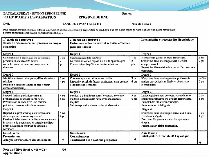 Quels objectifs en sections européennes ? BO n° 42 du 13 novembre 2003 I - Épreuve orale de langue, organisée par les recteurs d’académie, comptant pour 80 % de la note globale (durée de l’épreuve : vingt minutes, précédée d’un temps égal de préparation). L’évaluation est assurée par un professeur de la langue vivante de la section et, sauf impossibilité, par un professeur de la discipline non linguistique ayant fait l’objet d’un enseignement dans cette langue. Ces professeurs ne peuvent examiner leurs élèves de l’année en cours. L’épreuve comporte deux parties de même durée et d’importance égale dans l’attribution de la note.