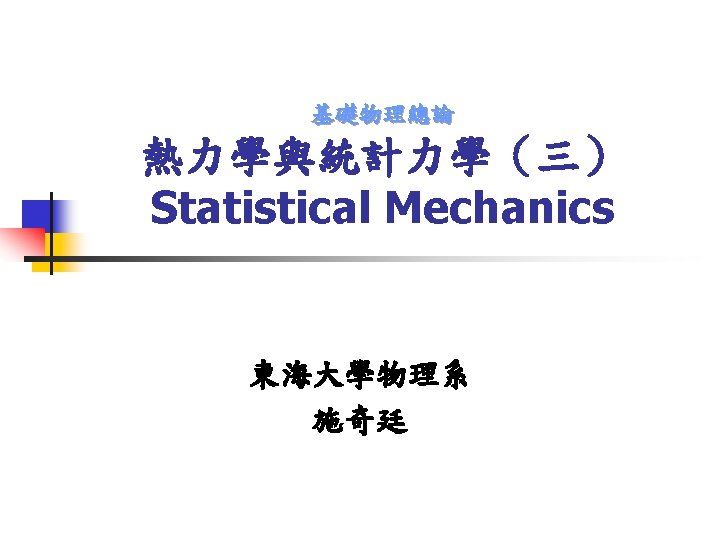 Ensembles (2/2) n n Microcanonical ensemble: ensemble 中所有系統的 N, V, U相等 Canonical ensemble: ensemble 中所有系統之N, V, T 相等 Grand canonical ensemble: ensemble 中所有系統 之μ, V, T 相等 在不同的條件下(constant temperature, constant pressure……etc. )使用不同的 ensemble 會比較 方便