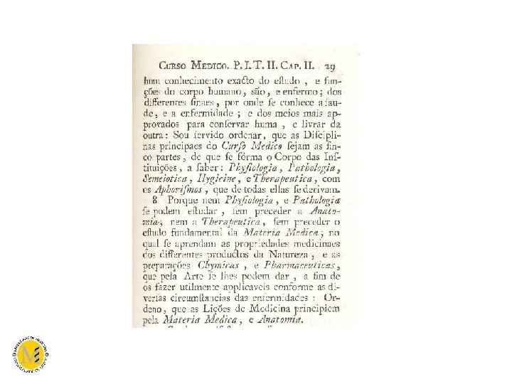 ENSINO DE MEDICINA NA EUROPA (séculos XVIII e início do XIX) • “. . . Medicine should be a Science using empirical means to establish new truths and educate physicians and practicioners” W. von Humboldt • “. . . Anatomy remains dead and incomprehensible without Physiology” Friderich Wertzel (1805)