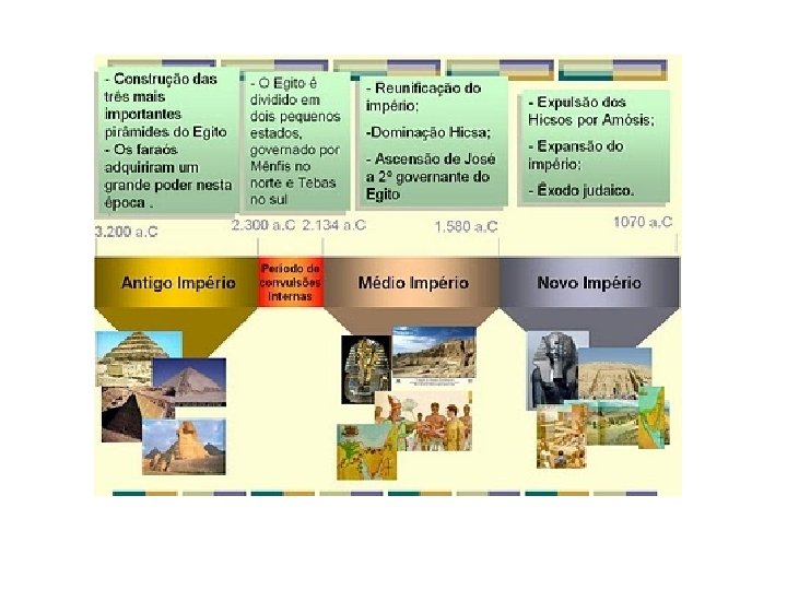 ANTIGO IMPÉRIO: centralização do governo, sistema administrativo eficiente, construção das pirâmides Quéops, Miquerinos e Quéfren; defesa das fronteiras, expansão territorial, expedições comerciais. Diversos problemas internos causa o fim desse período: diminuição das enchentes do Nilo, fome, pestes, gastos do Estado e revoltas sociais. MÉDIO IMPÉRIO: reunificação do Egito pelos reis da cidade de Tebas, que cultuavam o deus Amon (Rá, Amon-Rá). Atenção militar para as fronteiras do sul, na região do deserto da Núbia, gerando uma expansão territorial. Anexação do povo hebreu. Derrotados pelos hicsos (príncipes do deserto). Esses guerreiros usavam cavalos e carros de guerra e armas mais resistentes, desconhecidas pelos egípcios. NOVO IMPÉRIO: Expulsão do hicsos, fronteiras se expandiram para o norte e sul. Período de força militar, maior intercambio cultural e comercial. FIM DO IMPÉRIO: Dominação pelos estrangeiros: assírios, persas, gregos da Macedônia e romanos.