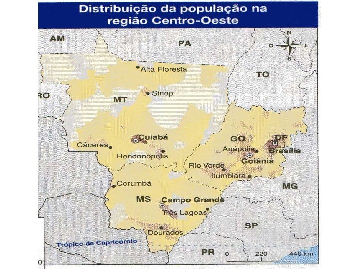 • A Região Centro-Oeste é dividida em quatro unidades federativas: Mato Grosso, Mato Grosso do Sul, Goiás e Distrito Federal, onde fica Brasília, a capital do país. Com uma área de 1. 606. 371, 505 km², a Região Centro-Oeste é um grande território, sendo a segunda maior região do Brasil em superfície territorial. • Por outro lado, é a região menos populosa do país e possui a segunda menor densidade populacional, perdendo apenas para a Região Norte.
