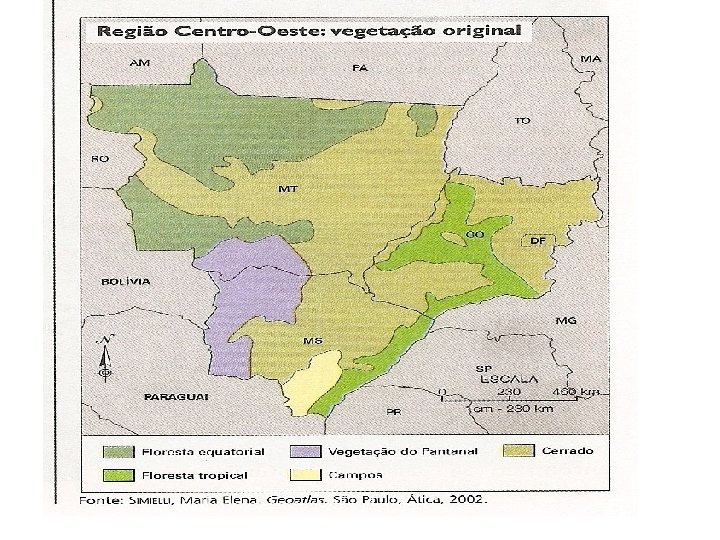Vegetação Formações vegetais bastante diferentes umas das outras. Ao norte e oeste aparece a Floresta Amazônica, praticamente impenetrável, composta por uma vegetação densa e exuberante. A maior parte da região, entretanto, é ocupada pelo cerrado, tipo de savana com gramíneas altas, árvores e arbustos esparsos, de troncos retorcidos, folhas duras e raízes longas, adaptadas à procura de água no subsolo.